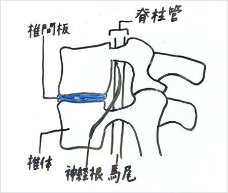加齢とともに背骨の間にあるクッション(椎間板)の劣化が起こり、背骨と背骨の間隔が狭くなる事により誘発されます。